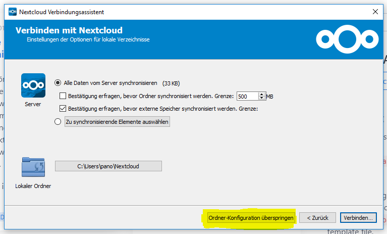 Doch bei der Einrichtung der Software, wenn ihr also die Software mit eurer Wolke verbindet, gibt es ein paar Dinge zu beachten. Falls ihr nur solche Daten automatisch abgleichen wollt, die in einem speziellen Ordner Nextcloud liegen: gut für euch, das ist die Voreinstellung (wie etwa bei DropBox auch). Wollt ihr aber wie ich manche Ordner aus eurer bisherigen Ordnerstruktur automatisch synchronisieren: diese Anleitung ist für euch: